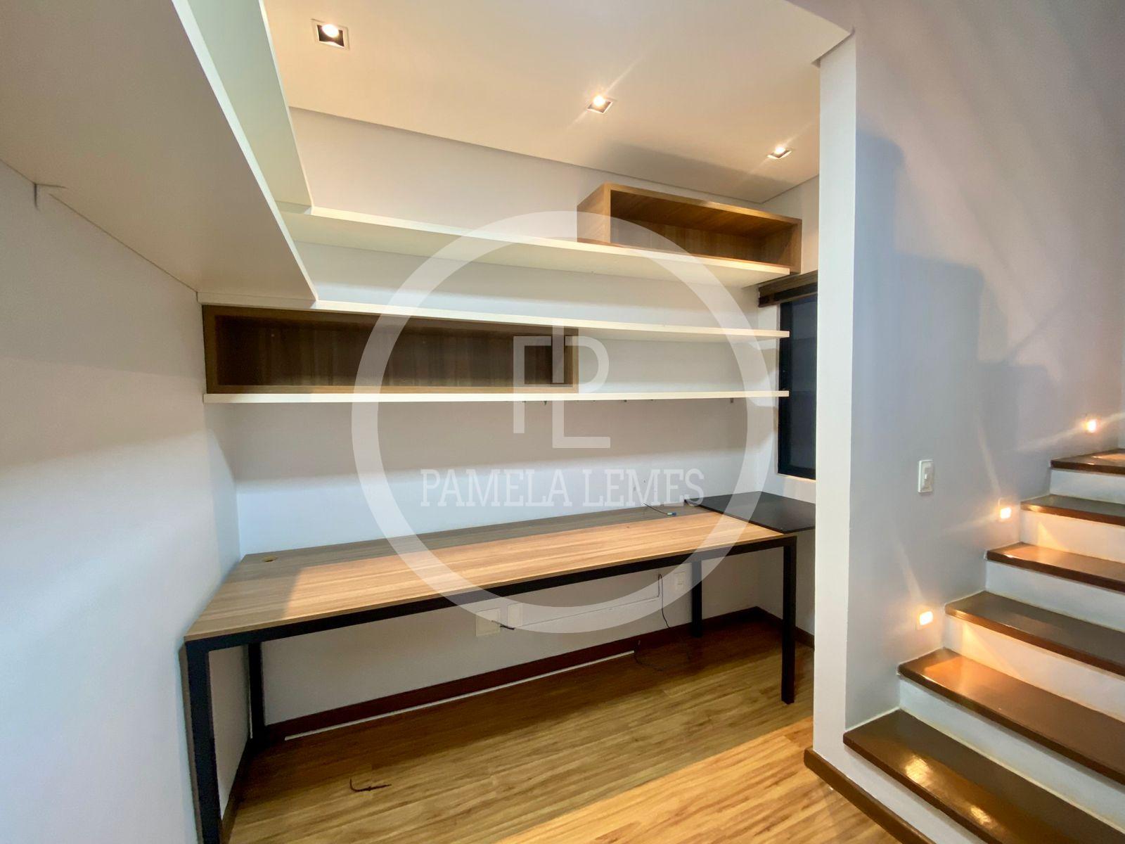Home office com mesa e nichos
