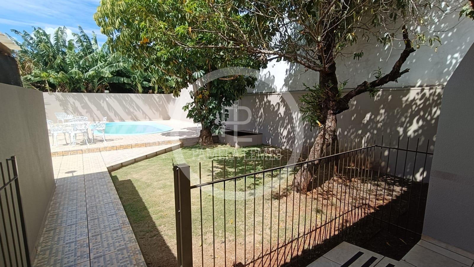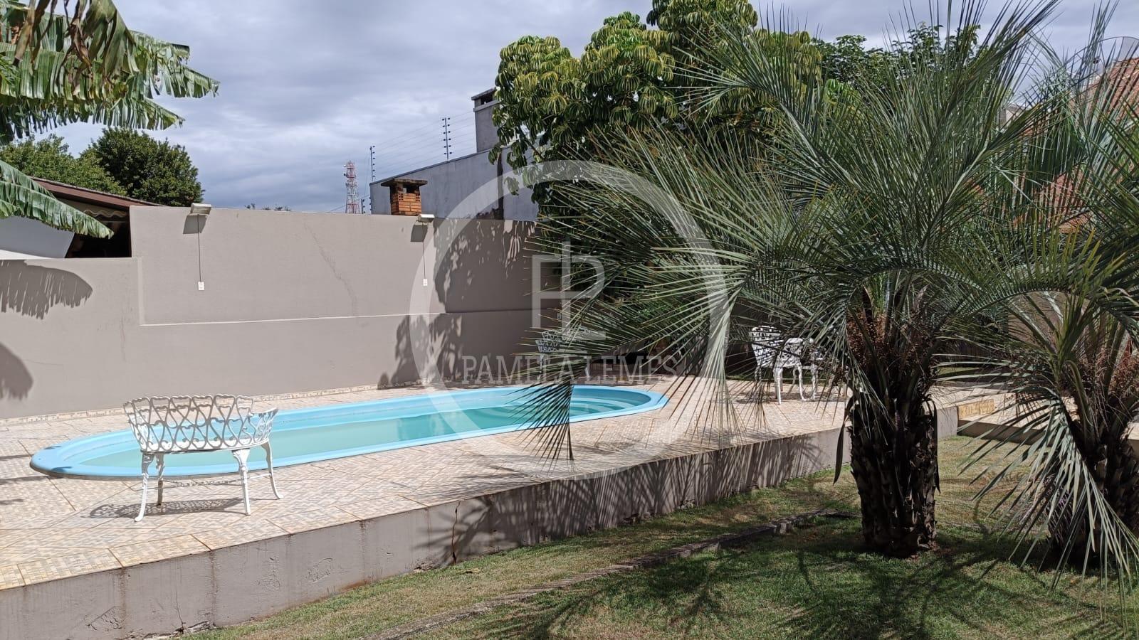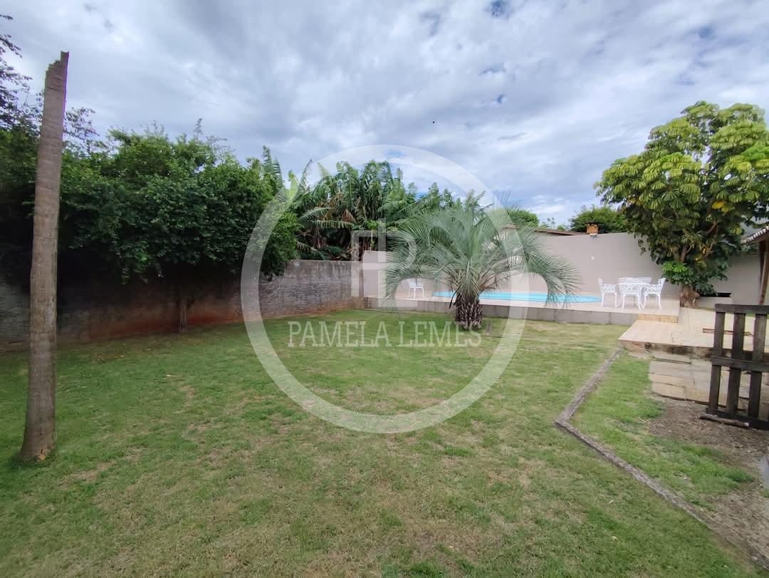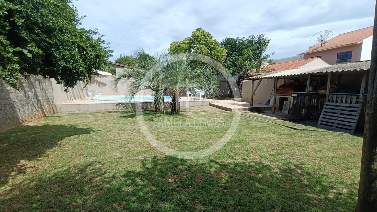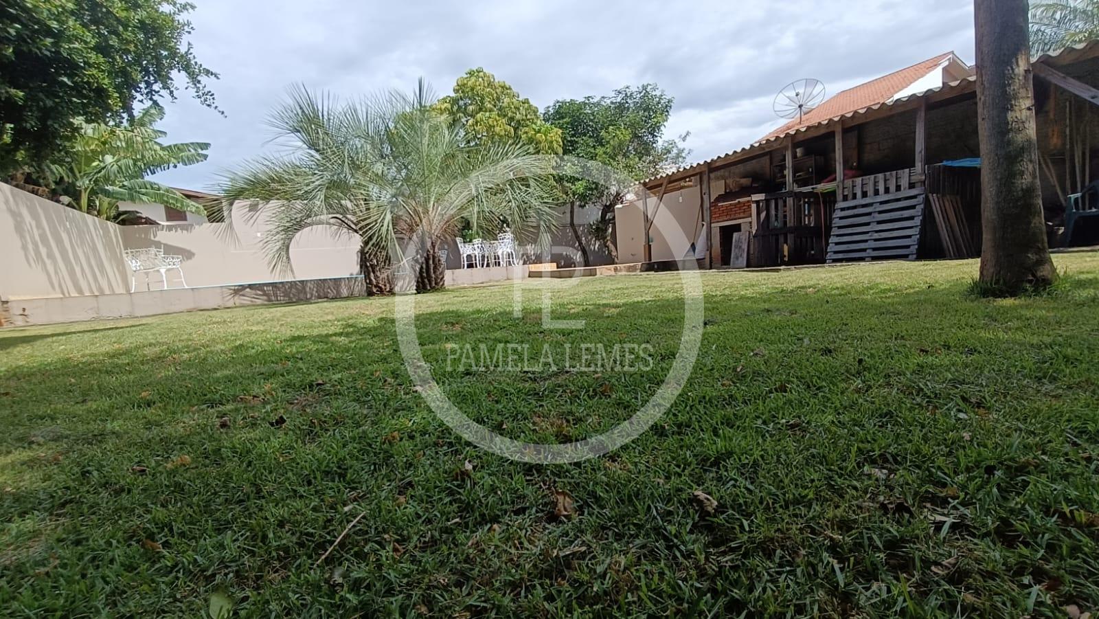 Piscina e amplo espaço com gramado e plantas frutíferas
